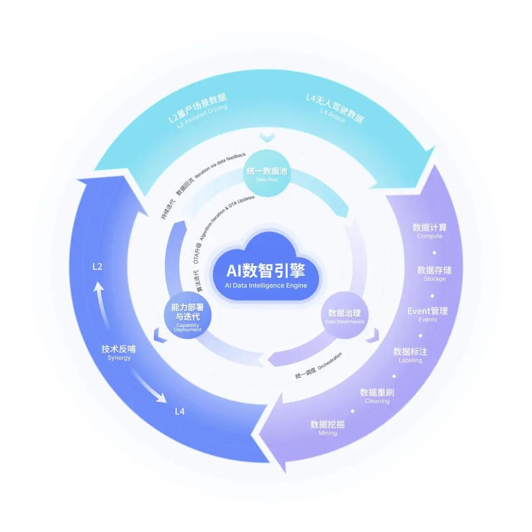 AI驱动下,L2乘用车与L4无人车在真实世界中采集海量常规路况数据,以及在长尾场景中捕捉极端工况数据,所有数据经回传、清洗、训练、迭代后,共同反哺智驾算法。每完成一轮数据闭环,物理AI对道路规则、动态交互、极端工况的理解就更精准,不断增强算法的泛化能力以及迭代速度。