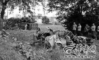 记者在现场看到,该侧路边的护栏有近50米被撞毁,发生车祸的出租车与大货车都翻在道路一侧的田地里。大货车翻了个身,出租车被撞得几乎散了架,一个车座飞出车体落在路边的草丛里。