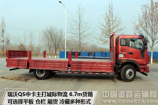 针对城际物流需求,瑞沃Q5推出有平板、仓栏、厢车、冷藏及二类底盘改装的需求,充分满足不同终端客户需求。