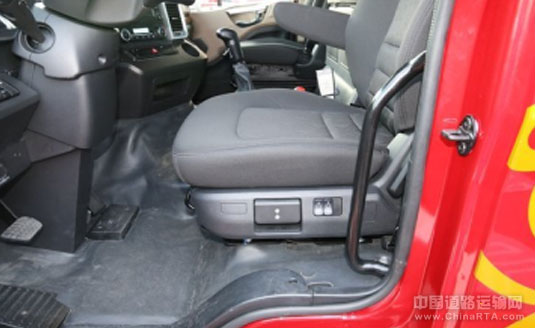 格栅变化只能算是小改款,真正的升级是在内部。格尔发A5三代牵引车采用了当前流行的平地板结构。虽然它的中部还有一个大约10cm的凸起,不能算作完全意义上的平地板,但相比过去的驾驶室来说,内部高度和通过性明显提升。地板中部距车顶有1.9m,没有了凸起的发动机罩,便于司机在内部的起居走动。