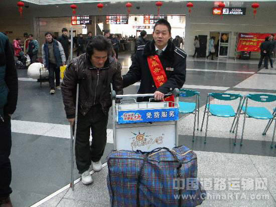 今年春运期间,车站努力在便民利民和改进服务上下工夫,将服务前移,在车站分别设立了几个服务点,让旅客一进车站“马”上有服务。一楼的咨询导乘台前,快乐大使陈艳正忙碌而又耐心地解答着旅客们的疑问。“您好,买票在二楼,前面电梯上去右手边就是。”“您好,37号门在三楼。”……旅客们在她的指引下,很快就到了需要去的地方。而在二楼安检处,为解决务工人员行李多、搬运难,缓解安检口的压力,吴建伟正推着便民小推车为旅客搬运着行李。“大爷,您去哪啊,那么多行李,您腿又不好,我帮您拿吧!”原来是在人群中发现了一位残疾人,他立马推着车上前帮助那位老大爷。“真是太好了,我去过那么多车站,还从来没见过这种服务,主动帮人家推行李,真好,谢谢!”