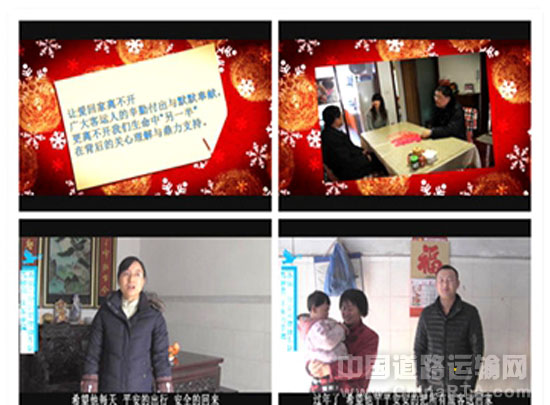 “春运到了,希望我老公呢,安全要第一,服务也要第一,家里请放心,有我呢!”“要过年了,希望老爸能把所有旅客都平平安安送回家,大家幸福了,我们自己家一定也能幸福的!”“你要记得注意休息,晚上在家电脑少玩玩,一心一意上好班,开好车,希望你每天都能平平安安出行,安安全全回家”……一句句亲切而又温馨的话语从客运二分公司快客三队和便捷车队现场值班室传来。原来这是车队安全早送教育正在播放的由分公司员工独立策划、拍摄并编辑制作的驾驶员家属的温馨提示视频短片。