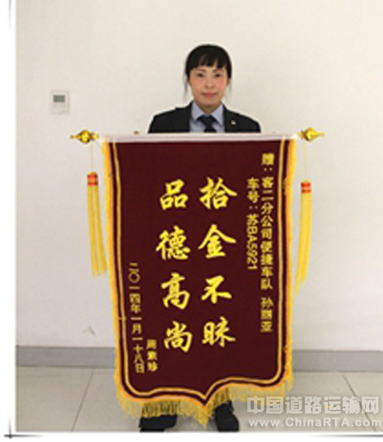 据悉,1月18日临近中午时分,孙丽亚驾驶璜瑭班车回到无锡汽车客运站,当她正做着车辆清洁工作时,突然发现临窗的座椅下放着一个包装精美的礼盒,当即她便下车寻找丢失物品的旅客,但苦等了半小时都不见失主。于是她将礼盒交到车队,便匆匆赶去执行下一个班次任务了。当天下午,周女士在获悉礼盒在车队后,便赶来了车队,“好久没回家了,这不买了点补品送给父母嘛,心急想回家就把这礼品落在车上”她一边不好意思解释着,一边想着当面对孙师傅表示感谢,却因小孙春运工作忙碌,未能如愿,于是她便和母亲送来了这面锦旗,以此表达谢意。