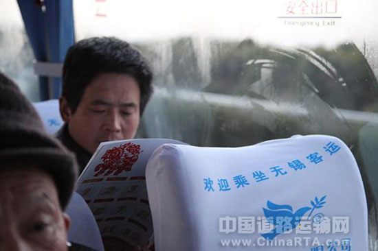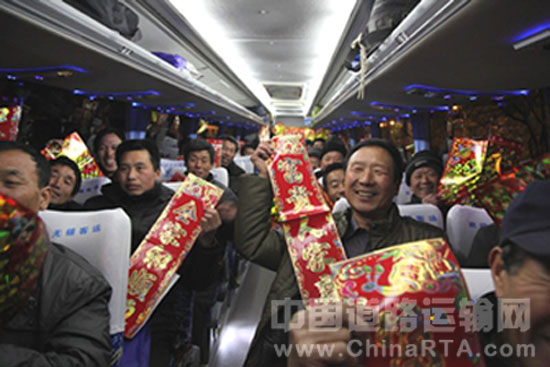 发车前,车站工作人员给每位农民工送上了一副春联,向他们拜个早年,大大的“福”字,与大家脸上的笑容相映成趣。赠送的礼包中不仅有车站的乐途杂志,还有水和面包。原来,这是公司怕路上堵车耽误民工们不能正常进服务区休息吃饭,而特意准备的。