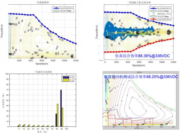 上图是实车按照NEDC工况跑下来的测试结果。我们对该车NEDC下的全部运行点做了统计,该图上半部分统计的是电驱动状态,图中这些数字是该运行点占整个工况运行的百分比,如果把全部数字在NEDC工况下运行的占比加起来是百分之百,电机的所有发电状态也是这样,把它们加起来也是百分之百。