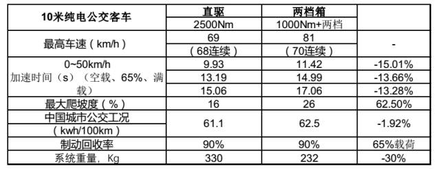 下图是10米纯电动公交客车性能参数,电驱动系统由电机加上一个两挡变速器组成。无论是从加速性能还是爬坡性能都很优越,和直驱相比回馈能量比较接近, 但是没有直驱那么好,这是通过比较得出的一个结论。通过优化运行控制,可以把功率损耗从7千瓦降到了4.8千瓦。