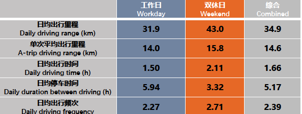 数据来源于上海电动汽车数据中心,时间跨度从 2014 年4月到 2014年12 月,数据量达到了4168 车天,总计 8154 次出行,总里程达到了 13 .9 万公里。单日出行里程在15公里以内总计占到总日均出行里程的44%。日均出行里程33km。可以看出,北京和上海的日均出行里程非常相似。