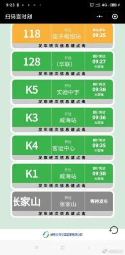 扫描站牌处的二维码,页面显示途经该站点的线路、【绿色】代表“下班车预计到达时间”、【黄色】代表“该线路首站发车时间”、【红色】代表“车辆已到达该站点”、【灰色】代表“等待发车”,点击发车班次,页面便会跳转至该线路始发站的发车时刻表。