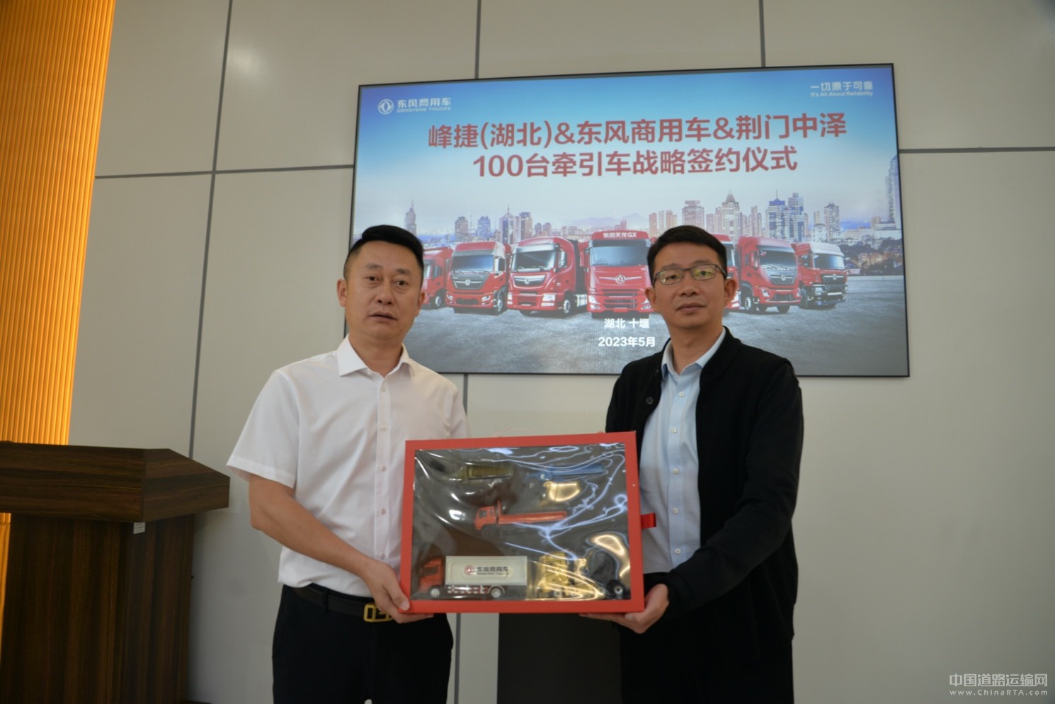 5月11日,峰捷(湖北)供应链有限公司、东风商用车有限公司与荆门中泽汽车有限公司在湖北十堰共同签署了采购100台东风天龙牵引车的战略合作协议。深圳市恒峰捷运国际物流有限公司兼峰捷(湖北)供应链有限公司董事长周长斌,深圳市恒峰捷运国际物流有限公司总经理陈涛,峰捷(湖北)供应链有限公司总经理黄俊峰,东风商用车有限公司营销公司总经理、后市场事业部总经理谢志鹏,东风商用车有限公司后市场事业部完好率中心部长方剑,东风商用车有限公司营销公司副总经理王冀及相关业务部门负责人参加了签约仪式。