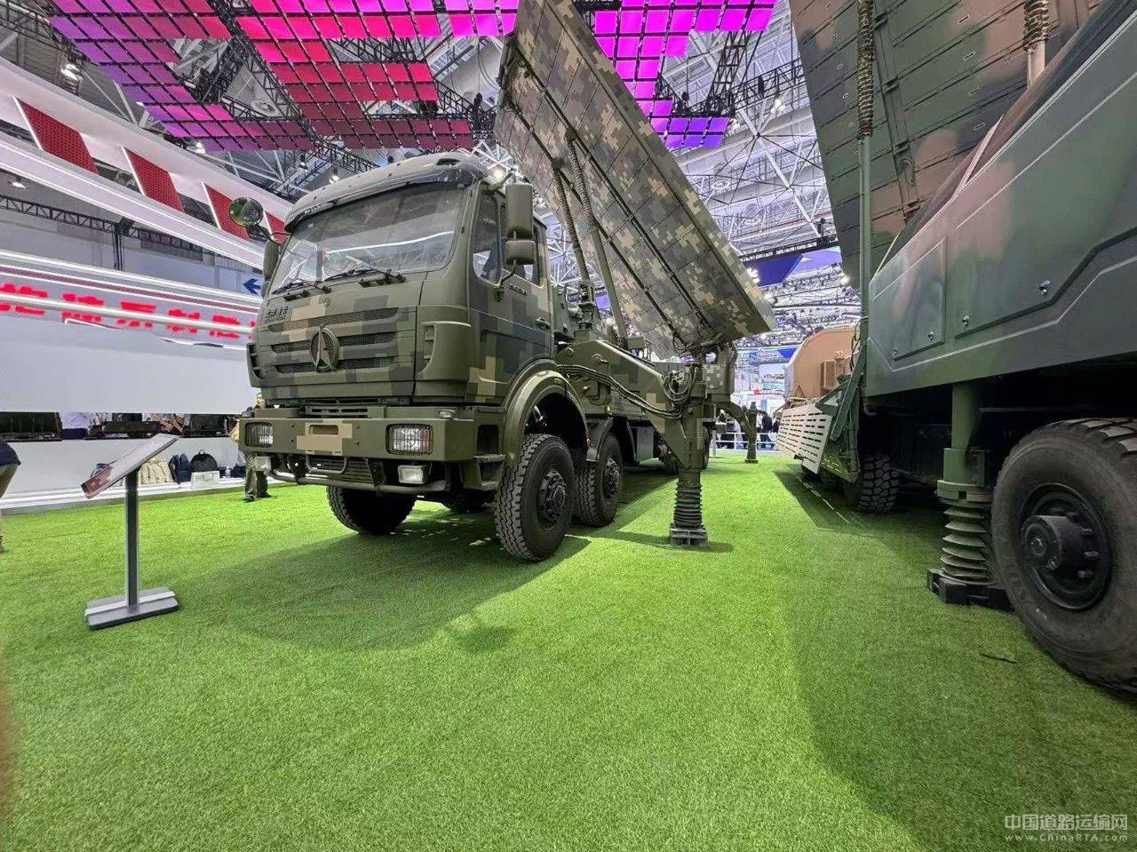 其中,由5台北奔重卡搭载的野战机动指挥所、通用营/连指挥所、通信服务站、155加榴炮和战术防空相控阵雷达在兵器展馆展出,2台北奔重卡搭载的蜂群陆战装备、特种雷达在其他展馆展出,4台北奔重卡搭载的各种波段雷达、蜂群装备和1台北奔重卡搭载的情报雷达在室外展区展出,共计展出九个型号车辆底盘。