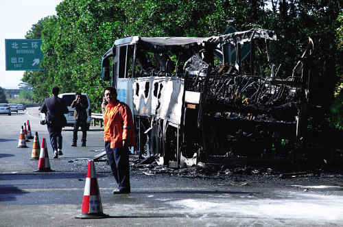 12时30分许,三辆消防车赶到现场。此时,大巴车已被大火吞噬。半个小时后,大火被扑灭,大巴车也已烧成一堆废铁。