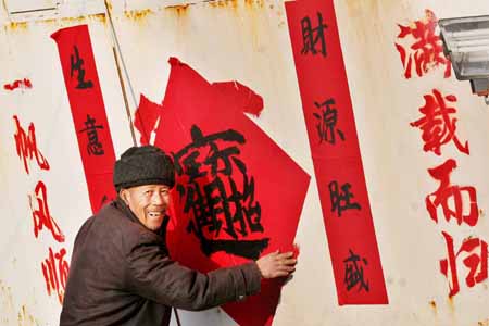 1月25日,赣榆县一位渔民在船上贴春联。当日是农历大年三十,江苏省赣榆县沿海渔村的渔民们按照传统习俗,在渔船上贴春联、放鞭炮,插上寓意“摇钱树”的毛竹,喜迎新年。