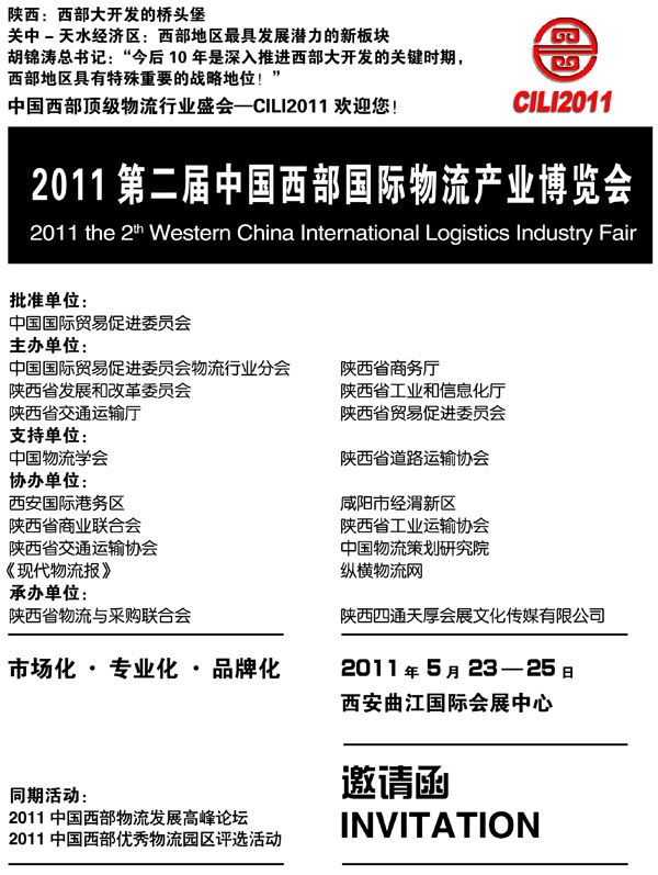 2011第二届中国西部国际物流产业博览会将于2011年5月继续在西安举办,组委会将联手西部地区近万家生产企业,众多西部生物制药、石油化工、涂料、造纸、食品、电力电子、半导体、等行业采购企业到会交流,并协同众多参展企业,倾力打造西部地区最大最专业的物流产业博览会。