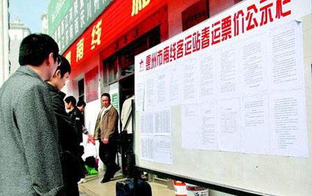 南线客运站场外边的公告栏里,详细张贴了省物价与公路部门关于春运票价的政策文件,还有当天各车次的价格表。张闻勋介绍,省里对今年春运的公路客运票价进行了改革,改变了以往上浮多少百分点的方式,改为设定 “最高限价”,而且每次价格调整前,都得提前5天到市物价部门备案登记。他表示,随着客流的变化,票价还可能有所变动,但变动幅度不会很大。