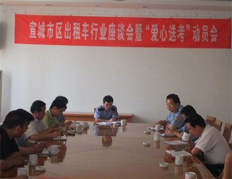 六月二日下午,宣城市运管处会同市交通文艺广播电台、区运管所召开了由市区六家出租汽车公司负责人、部分出租汽车驾驶员代表参加的市区出租汽车行业座谈会暨“爱心送考”动员会。
