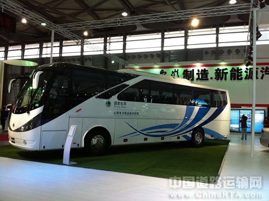 这次安凯客车参展是12米纯电动豪华客车——HFF6127K46EV。该款纯电动客车采用了全承载车身技术(国家发明专利:ZL 2006 1 0086351.4),在大幅降低车身重量的同时强化车体刚性强度。我们知道车载电池要占用纯电动客车上很大的车内空间和车身重量,而采用全承载车身技术的安凯纯电动客车一方面使电池布局更为合理,另一方面由于车身重量的降低,大大提升了安凯纯电动客车的续驶里程。该款纯电动客车动力系统采用磷酸铁锂电池加超级电容,电机直接驱动,平均每公里仅耗1.16度电(116度/100Km)。特别值得注意的是该款客车的整车控制系统和电机系统都是由安凯客车独立研发的,凸显了安凯客车自主创新实力。该款纯电动客车在原有气制动基础上,辅助以电制动,使制动效果比同类燃油车辆要好,安全性更高。