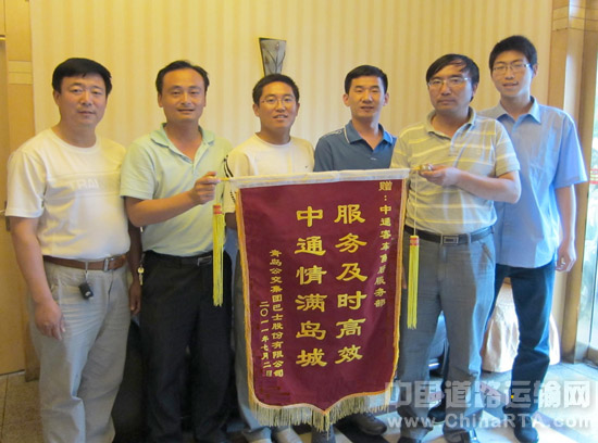 2011年7月6日,青岛公交集团巴士公司总经理于飞专程赶到中通客车青岛办事处将一面写有“服务及时高效 中通情满岛城”的表扬锦旗送到山东办事处主任凌华手中,对中通客车在山东售后工作中所提供的服务表示由衷感谢。