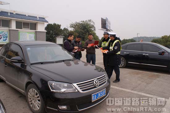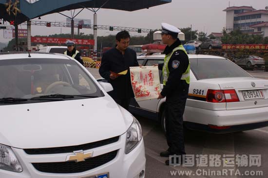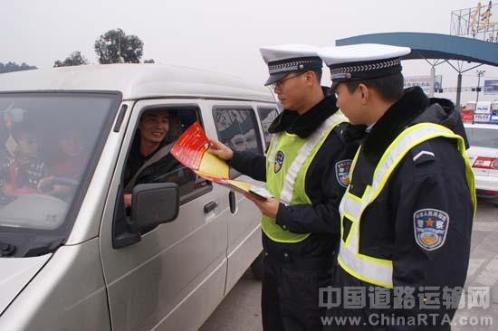 民警们发放《春运交通安全常识》提醒广大驾驶人注意交通安全