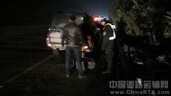 当晚20时许,广西高速交警一大队民警巡逻辖区泉南高速由桂林往柳州方向途经1136公里苏桥路段时,发现该段路面砖头石块,不远处有一辆浙江号牌的越野车开启双闪警示灯停靠在应急车道内,闪烁的尾灯在黑夜中格外显眼。民警们随即上前询问。“我的车行驶在这段路上,压过一个大块红砖后,只听到‘嘭’地一声,停在紧急车道后我下车查看,才发现车的右后轮爆胎了。”越野车车主因车上工具不齐,无法自行修理,只能在原地等待救助。此时正值黑夜 ,视线不佳,高速公路车速快,如引发事故则后果不堪设想。了解情况后,民警们二话没说,立刻组织车上除驾驶员以外人员下车,站到护栏外,随后在车后200米处放置好三角警示标示。嘱咐他在高速公路上一定要做足相关的安全警示标示并疏散车上人员后再进行简单的维修。说罢,民警们从车辆后备箱中拿出千斤顶和扳手,熟练地帮助车主换好了轮胎。“在我们之前停在这的共有三辆车,其中两辆修好轮胎后已经开走了,我们又冷又饿,好在你们来了,如果不是你们雪中送炭,我们还被困在这里,感谢高速交警为我们做的一切!”