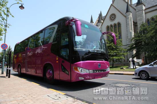 在2013北京国际道路运输展上,上海申龙客车首次向外界展示了旗下最新两款公路车产品,其中一款11米级公路客车颇引人注目,相信凡到之人一定对这款粉红时尚的申龙SLK6118豪华客车印象尤为深刻。作为2013年申龙主推的客运旅游产品,SLK6118/6128客车集安全、智能、节能典范于一身,一经问世,并陆续接到来自上海、辽宁、天津、江苏等地的批量订单,短短数月时间里,该车型已经累积销售近100余台。日前,17台SLK6118整齐排列,即将交付天津市原野汽车客运有限公司。