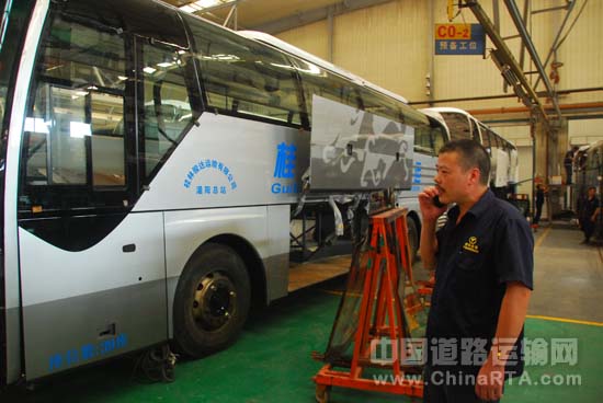 走进总装车间,“广西运德、桂林骏达运输有限公司……”生产线上停满了各地旅游公司订购的豪华旅游车以及月底即将交付北京、塔城的公交车。在一辆刚刚装上发动机的豪华大客车旁边,不停地打电话的是金华青年汽车制造有限公司副总经理陈尚宝,汗珠汇成了一道道的水流,川流不息地从他那坚毅而略带笑容的脸上挂下来,浸湿了他的工作服。他刚刚挂了电话,用他那双大手抹了一把脸上的“水流”,又一个电话打进来了,他尽量压低声音,显得温和一些,可汗流还是覆盖了他的眼睛、鼻子、嘴巴,于是他不得不又变得有些和外面的太阳一样,有点暴躁起来,“又要停吗?不是说好照顾我们的?!”他刚刚接到今天上午9点左右将要限电的通知,但是9点多将有一批客户前来考察。为了让客户尽可能直观地了解青年客车的生产工艺、流程,陈尚宝马上联系相关部门协调,要求先保证车间用电。