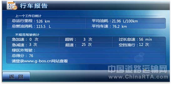 马永升表示,除了上述功能之外,G-BOS还可以进行故障预警,离合器打滑了、空滤该换了都有预警。“有一次我们通过数据发现一辆车的刹车距离过长,我们立即检查了该车的刹车系统,检查ABS的探头,发现是探头脏了,缓速器就不起作用了,追查到是上次保养的时候没有清洗干净,探头上留有黄油。可见,它对安全管理也有很大帮助。再比如说驾驶员没关好车门就开车,行驶中突然倒车,应该一挡起步他二挡起步,都可以看出来,这时候我们会电话联系驾驶员提醒他规范操作、安全驾驶。有的驾驶员出门晚了,为了赶时间而超速行驶,这也是安全隐患,G-BOS对超速车辆也会进行提醒。另外,车速过慢也不行,因为被撞也是一种损失,这些不规范行为都可以通过G-BOS了解到。我们安装G-BOS的目的不是防备、监视驾驶员,而是为了防患于未然,在它面前,谎言将被‘打回原形’,它在实时管理上的帮助不仅可以让车队的管理上一个台阶,而且对于驾驶员个人来说百利而无一害。”马永升如是说。