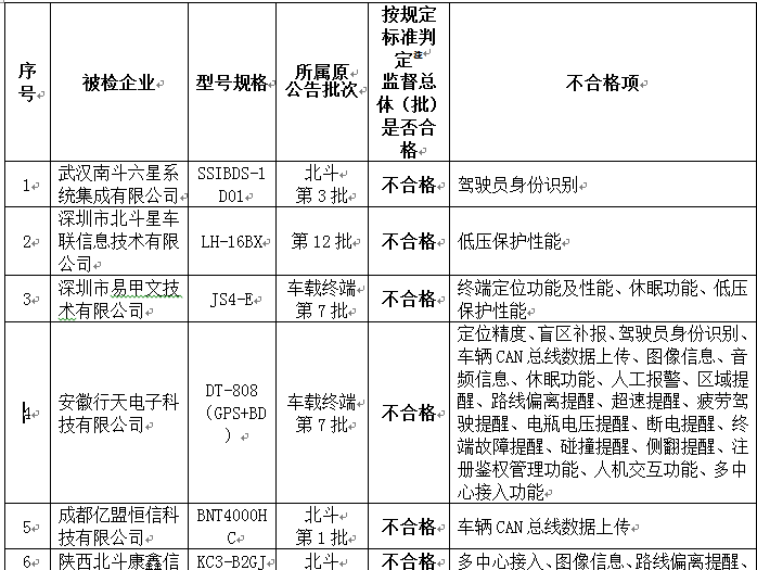近日,交通运输部根据《交通运输部办公厅关于2015年度道路运输车辆北斗导航车载终端和电子不停车收费(ETC)产品质量行业监督抽查结果的通报》(交办科技〔2015〕181号)及《交通运输部办公厅关于进一步做好道路运输车辆卫星定位系统车载终端和平台标准符合性技术审查工作的通知》(交办运〔2015〕18号),检查出武汉南斗六星系统集成有限公司等单位生产的6个型号道路运输车辆卫星定位系统车载终端质量不合格,6个型号车载终端从所属原公告批次目录中撤销,两年内不予受理其所属企业标准符合性技术审查申请。