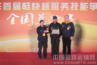 颁奖典礼上,联合卡车总经理唐钢亲手将首座“畅快杯”交给了冠军团队。唐总表示:2015年,是联合卡车服务全面提升的一年,通过主动、全方位的服务为联合卡车产品赢得一大批忠诚用户。很高兴在走访市场的过程中,用户对于联合卡车的褒奖越来越多。希望联合卡车能够重视并利用好在此次比赛中涌现出的技术人才,做到人尽其才,才尽其用,使联合卡车的畅快体验服务品牌深入人心。