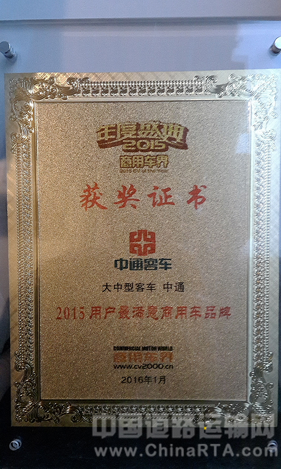 2016年1月15日,在北京举行的“2015商用车界年度盛典”上,中通客车凭借2015年出色市场表现和良好市场反馈,赢得了用户、活动主办方及业界人士的一致认可,获得两项大奖。其中,中通客车荣获“2015用户最满意商用车品牌”称号,中通LCK6850EVG1纯电动城市客车则被评为2015年“年度公交”。