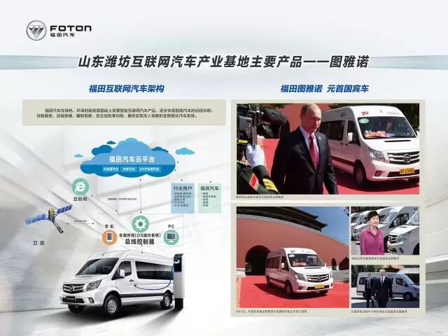 1. 目标远大,中国首个互联网汽车产业基地瞄准超2800亿年销售收入福田汽车在山东现有潍坊高新区乘用车基地和诸城卡车基地,根据当天签署的协议,福田汽车将在现有两大基地基础上,加大投资建设新的绿色智能基地,这是福田汽车贯彻落实国家“十三五”规划的第一个项目。该项目建成后,不仅将成为全国最大的智能制造和互联网汽车产业基地,也将开启福田汽车集团和山东浪潮集团、潍柴集团共同转型升级、携手互利共赢的新局面。