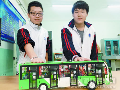 在前不久举办的北京市中小学生创客秀上,来自大兴八中高二(1)班的两名男生王鑫宇、王子敬展示了他们为解决上述问题特别设计的智能新型公交车,引起了大家的关注。目前,这个创新作品已在青少年科技创新大赛和金鹏论坛上分别获得了大兴区一等奖,两名高中生正在为参加市级比赛做准备。