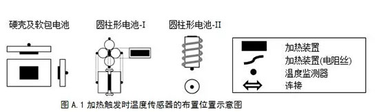A.3.2 使用平面状或者棒状加热装置,并且其表面应覆盖陶瓷,金属或绝缘层,加热装置的功率要求见表A.1。完成测试对象与加热装置的装配,加热装置与蓄电池应直接接触,加热装置的尺寸规格应不大于测试对象的被加热面;安装温度监测器,监测点温度传感器布置在远离热传导的一侧,即安装在加热装置的对侧(如图A.1)。温度数据的采样间隔应小于1 s,准确度要求为±2 ℃,温度传感器尖端的直径应小于1 mm。