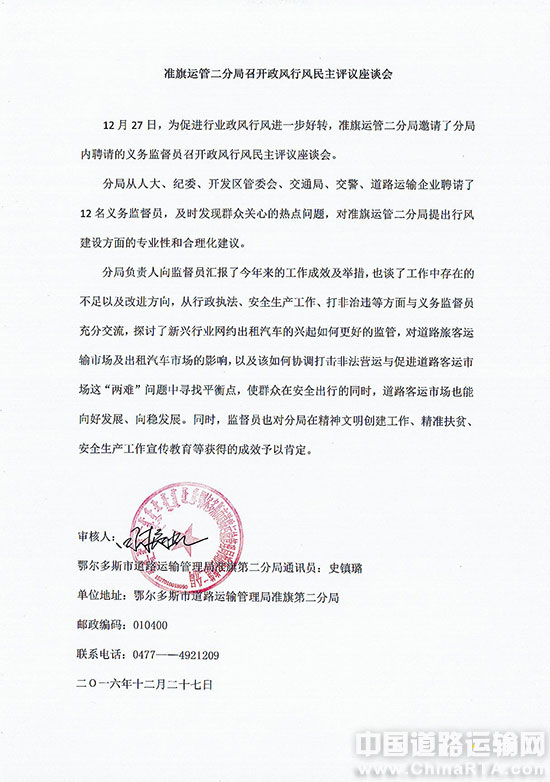 12月27日,为促进行业政风行风进一步好转,准旗运管二分局邀请了分局内聘请的义务监督员召开政风行风民主评议座谈会。