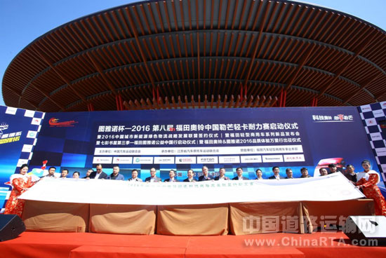 (国家体育总局汽车摩托车运动管理中心副主任、中国汽车运动联合会副主席万和平和福田汽车集团党委副书记赵景光为赛事指定赛车揭幕)