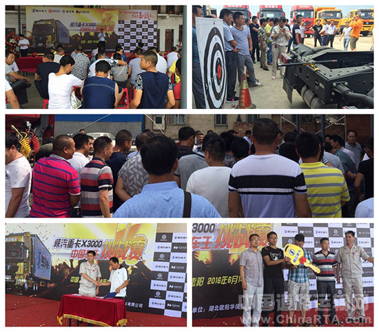 6月14日,陕汽2016X3000中国车王挑战赛枣阳站激情上演。陕汽武汉办服务经理赵宝辉、潍柴武汉办主任杨源飞、厦工楚胜(湖北)专用汽车有限公司区域经理邓高波、陕汽湖北中心库杨富广经理、湖北欧阳华骏专用汽车有限公司总经理欧德保、枣阳欧阳鑫成服务站总经理张心爽以及当地客户130余人参加,并成功签单8台,意向订单20余台。