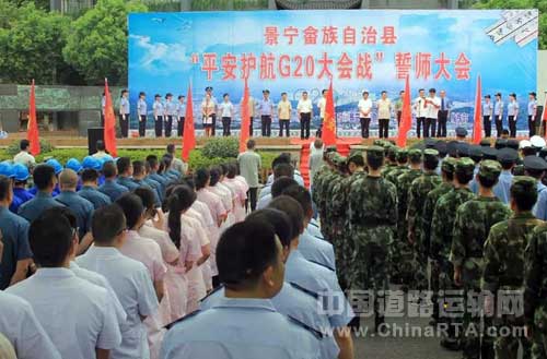 日前,景宁县举行“平安护航G20大会战”誓师大会。丽水市人大常委会副主任、县委书记林康出席并讲话,县委副书记、县长蓝伶俐主持,县领导严轶华、王新荣、潘伟等参加誓师大会。