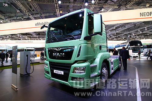 针对备选动力系统方案主题,曼恩在汉诺威展出了一款电动概念车。纯电动的 MAN TGS 半挂牵引车被设计用于夜晚的市内交货,例如食品零售业中的送货到店。概念卡车能在低自重和零排放(CO2、NOx、噪音)的情况下提供大装载量。