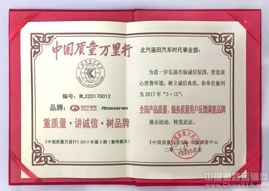 近日,福田汽车时代事业部获得由《中国质量万里行》市场调查中心颁发的2017年“3·15”“全国产品质量、服务质量用户反馈满意品牌”荣誉证书。