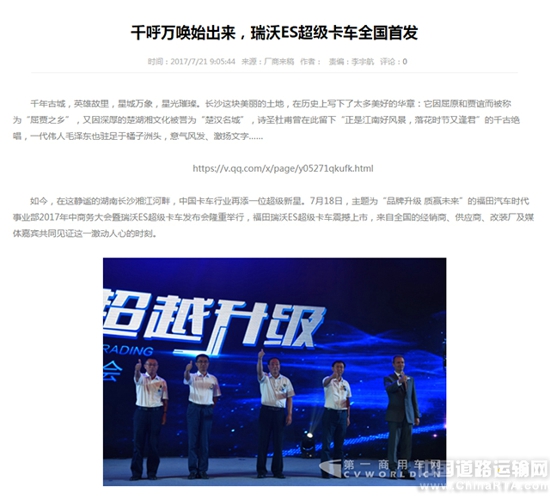 7月18日,在美丽的湖南长沙湘江河畔,主题为“品牌升级 质赢未来”的福田汽车时代事业部2017年中商务大会暨瑞沃ES超级卡车发布会隆重举行,一个卡车行业的超级新星——福田瑞沃ES超级卡车质领上市。本次盛会引起了各界人士及行业媒体的高度关注,其中包括卡车之家、第一商用车网、中国卡车网、今日头条等在内的百余家行业权威媒体进行了全程跟踪报道。