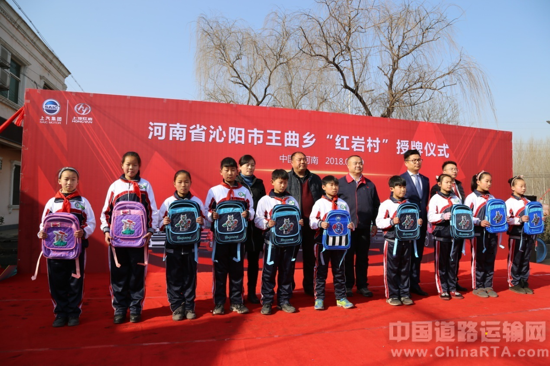 红岩村授牌仪式现场,10名学习成绩优秀的小学生拿到了漂亮的书包,将来他们考上大学后,也将受到“红岩村”帮扶项目的支持,帮助他们完成学业。伴随着一座座“红岩村”的落地,越来越多的人也将因此受益,上汽红岩以实际行动践行十九大精神,践行社会责任,为实现全面小康的伟大目标贡献一份力。
