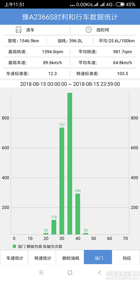 他分析上述图中的“油门深度”,“800次以上采用了35%油门开度,737次采用了30%油门开度,294次采用了40%油门开度……”。这意味着,重汽“智能通”在车辆全程运行中,比如油门一项,在不同油门开度,每一次行为都被精准记录并被归类,最终形成全程油门报告。