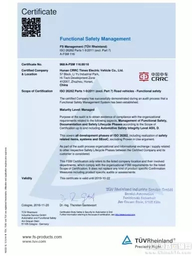 近日,中车电动获得德国莱茵TÜV集团颁发的ISO26262道路车辆功能安全管理体系认证证书,成为国内首个通过该项认证的新能源商用车整车制造企业。