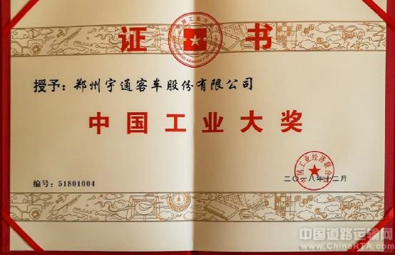 宇通荣获中国工业大奖证书