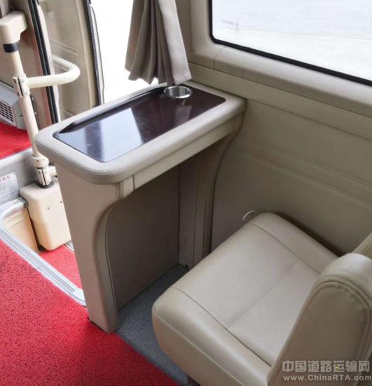中通氢燃料商务车不仅在车辆左侧首个座椅处装配了一个办公桌,在右侧也配置了一个小办公桌,有水杯槽、储物柜以及220V电源接口,极大地方便了移动商务办公的需要,极大提升了商务接待的服务水平。