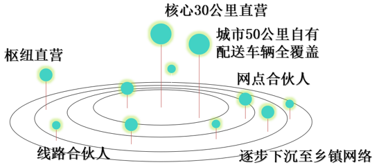 其次,安吉采用枢纽直营、网点和线路合伙人、及大力发展自营移动门店的方式,且由于安吉在干线物流上优势不大,因此采用核心区30公里直营配送的模式。