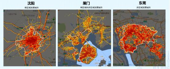 数据显示,沈阳是一个典型的单区域发展的城市,从沈阳的热力图中可以看出城市出行过度集中在中心城区,而周边除了高速没有热度,厦门是一个将要从单区域向多区域过渡的城市,从热力图中可以看到,厦门岛上热度非常的高,而与岛相连的集美区虽然较岛上较弱,但已经呈现较热的趋势,有希望过渡到多区域发展城市。多区域发展城市东莞从热力图上可以看到区域整体呈现高热力情况,是典型的多区域发展城市。