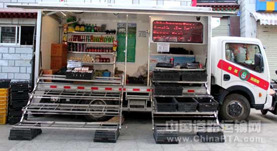 流动蔬菜售卖车上销售的蔬菜不仅新鲜且品种繁多,而且还有新鲜的肉类及各种粮油,车上还配有专用的购物袋。
